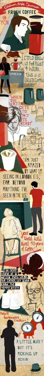 Young Barista prodigy Callum Hale Thomson has been at YCN for the past two weeks manning his pop up coffee shop. I’ve been busy documenting the comings and going of the coffee loving public and have created this illustration to record the event.